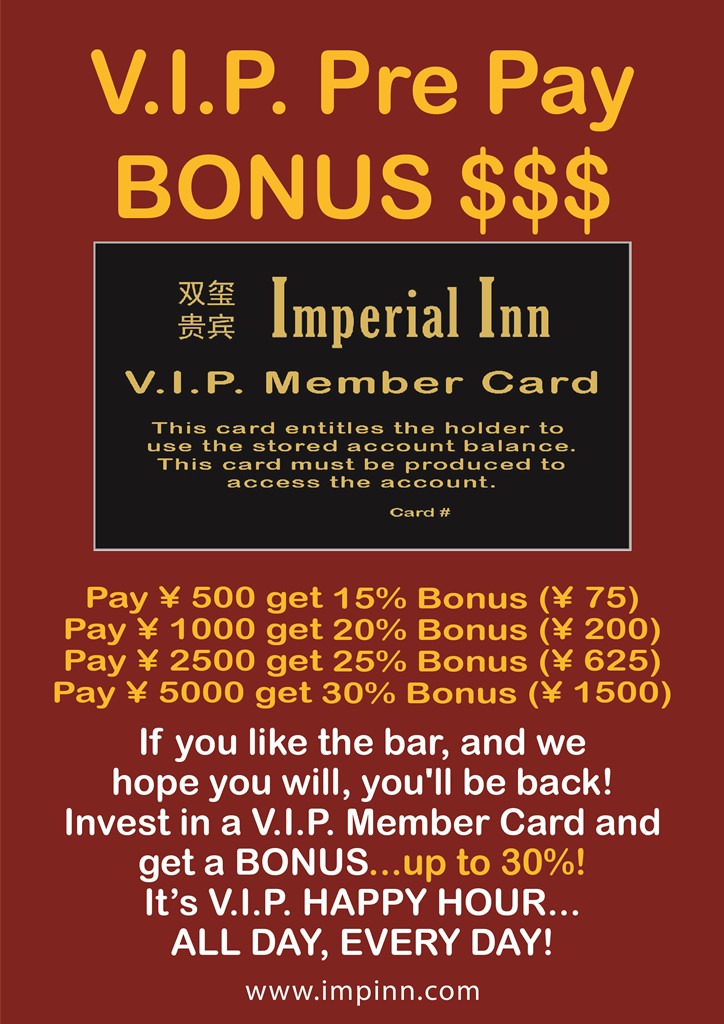Buy a VIP Pre Paid Card & enjoy UP to 30% BONUS...better than a Happy Hour discountfor part of the day.